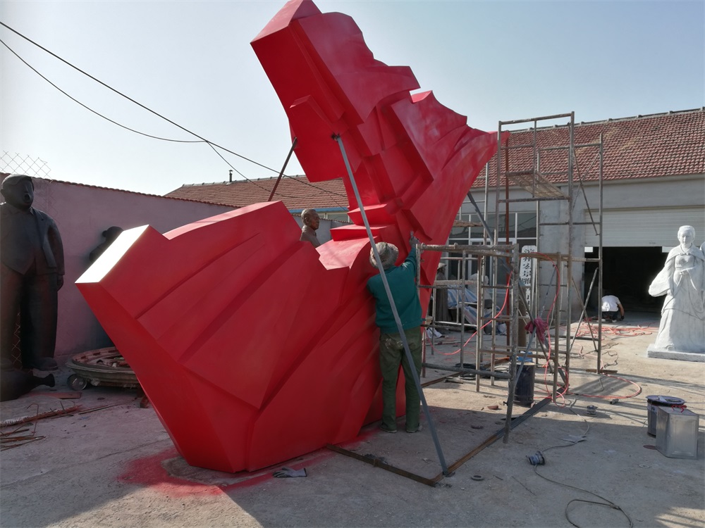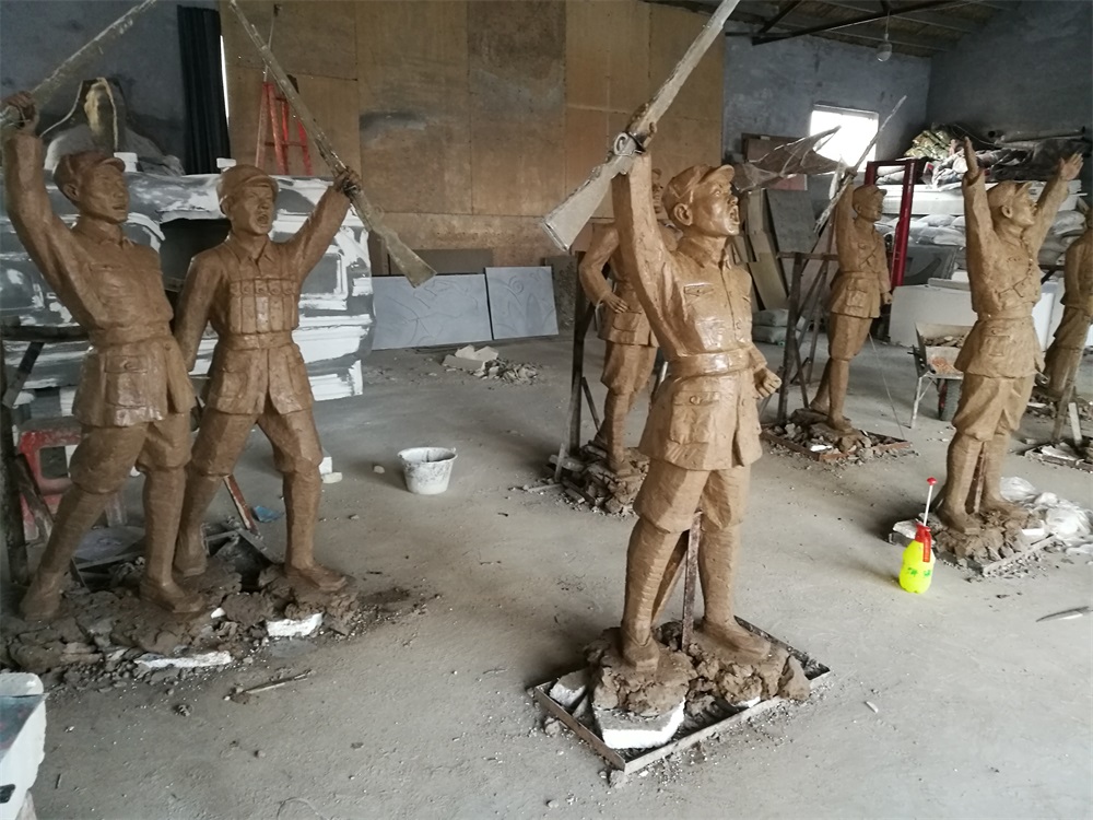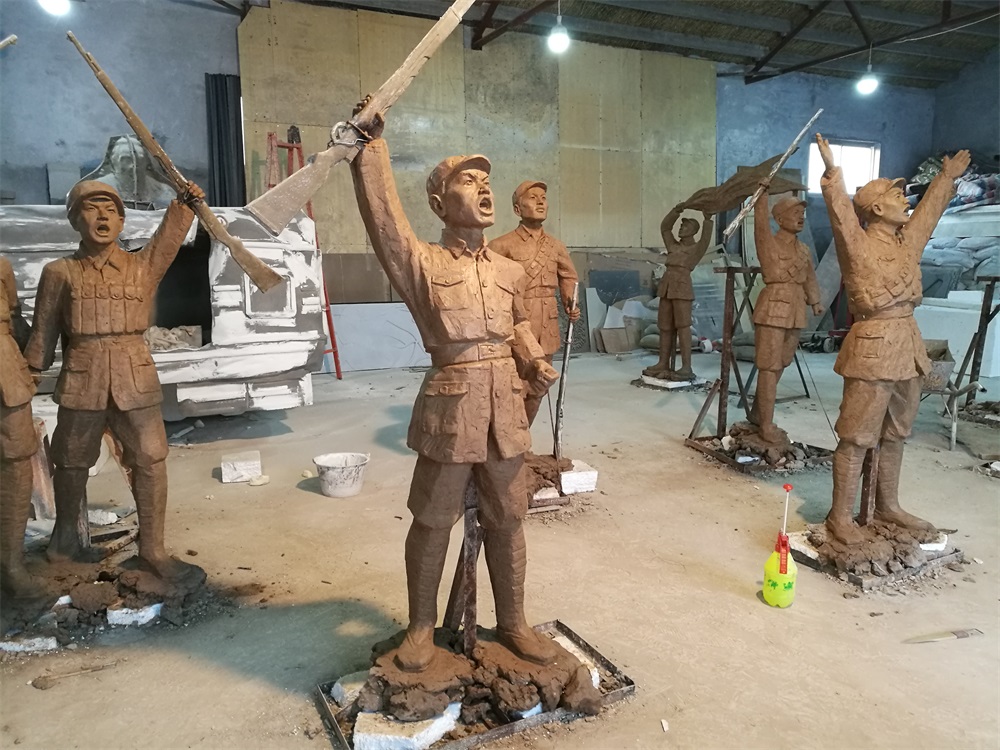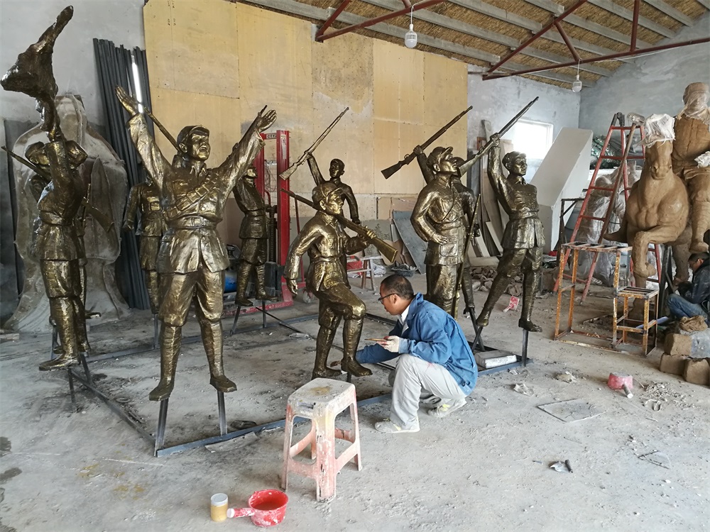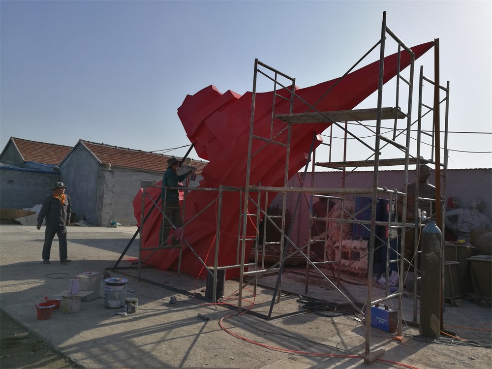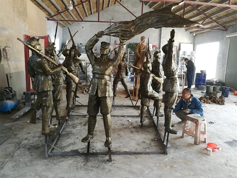 雕塑說明:紅旗雕塑采用不銹鋼鍛造工藝做型,高4米,長8米。人物群雕共10個(gè)人物,采用玻璃鋼工藝制作。
