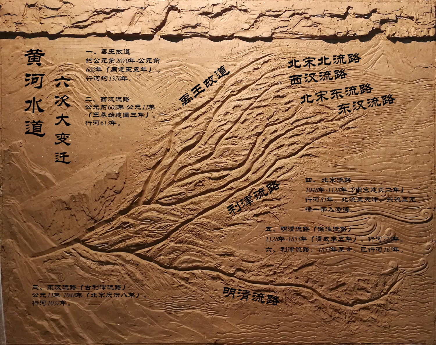 據(jù)歷史文獻記載,黃河的河道變遷主要發(fā)生在下游,歷史上有記載的黃河決口泛濫達1593次,較大的改道26次,大改道有5次(行河于六條大流路,其中有兩次經(jīng)由利津一帶入渤海),河道變遷范圍大致北到海河,南達江淮。