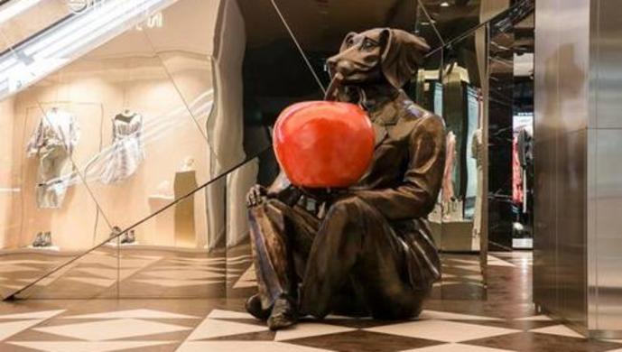 該雕塑是澳大利亞藝術(shù)家夫婦Gillie和Marc“帶著愛走天下”(TravelEverywhereWithLove)系列作品中的一個(gè),此系列作品都以狗頭或兔頭配以人的身體為特點(diǎn),鼓勵(lì)大家放下不同、相親相愛。